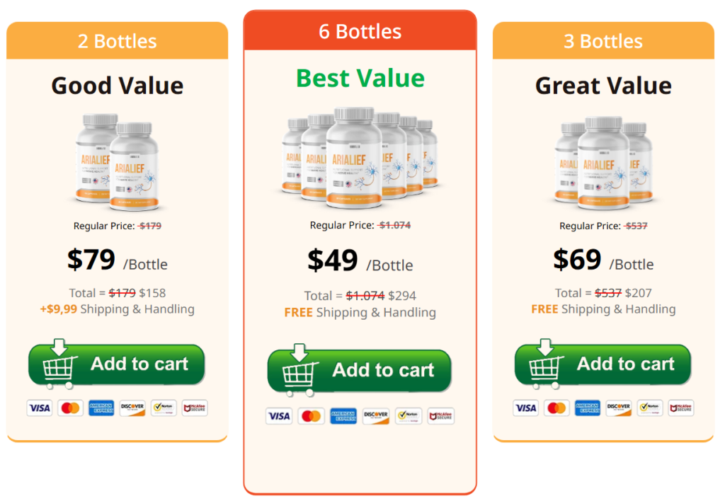 At the time of writing, one bottle of Arialief retails for $89, which is best suited for those testing the formula short-term. But for users seeking long-term neuropathy support, the 3-bottle bundle at $59 per bottle or the 6-bottle bundle at $49 per bottle offer far better value. Each order comes with free U.S. shipping, and bulk bundles include additional bonus eBooks focused on nerve health, anti-aging, and inflammation support.